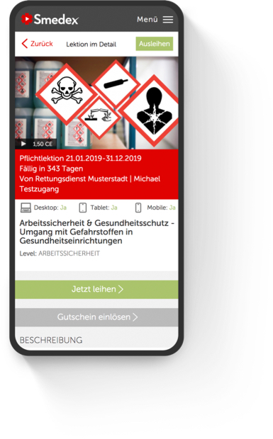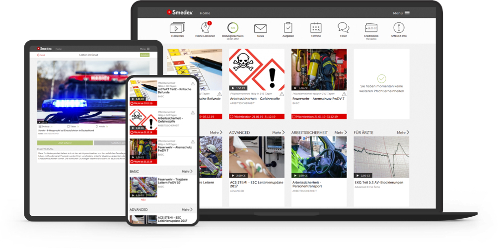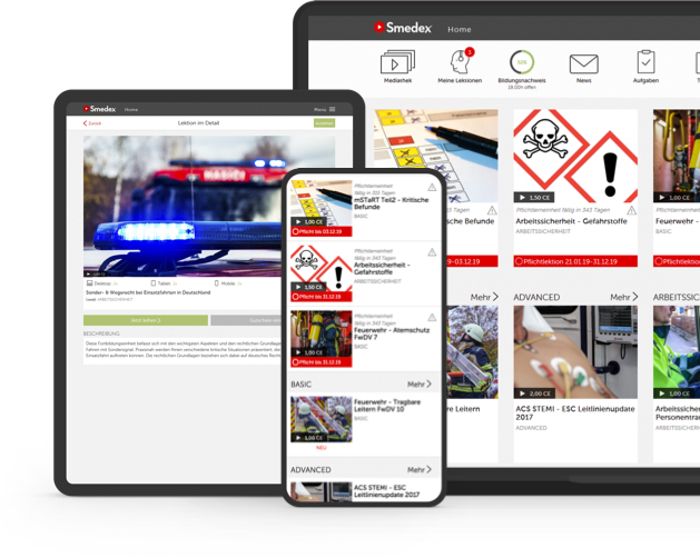 Auf diese Weise lassen sich unter anderem Instruktionen, Pflichtunterweisungen und Schulungen zum Thema Arbeitssicherheit mit Smedex ergänzen. Ein weiterer Vorteil der Online-Lösung: Der Fortbildungs-Status und alle hinterlegten Bildungs-Nachweise jedes einzelnen Mitarbeiters sind jederzeit online einsehbar; den klassichen Präsenzunterricht können Sie mit Smedex organisieren sowie verwalten und dadurch Ihren Administrationsaufwand weiter reduzieren.